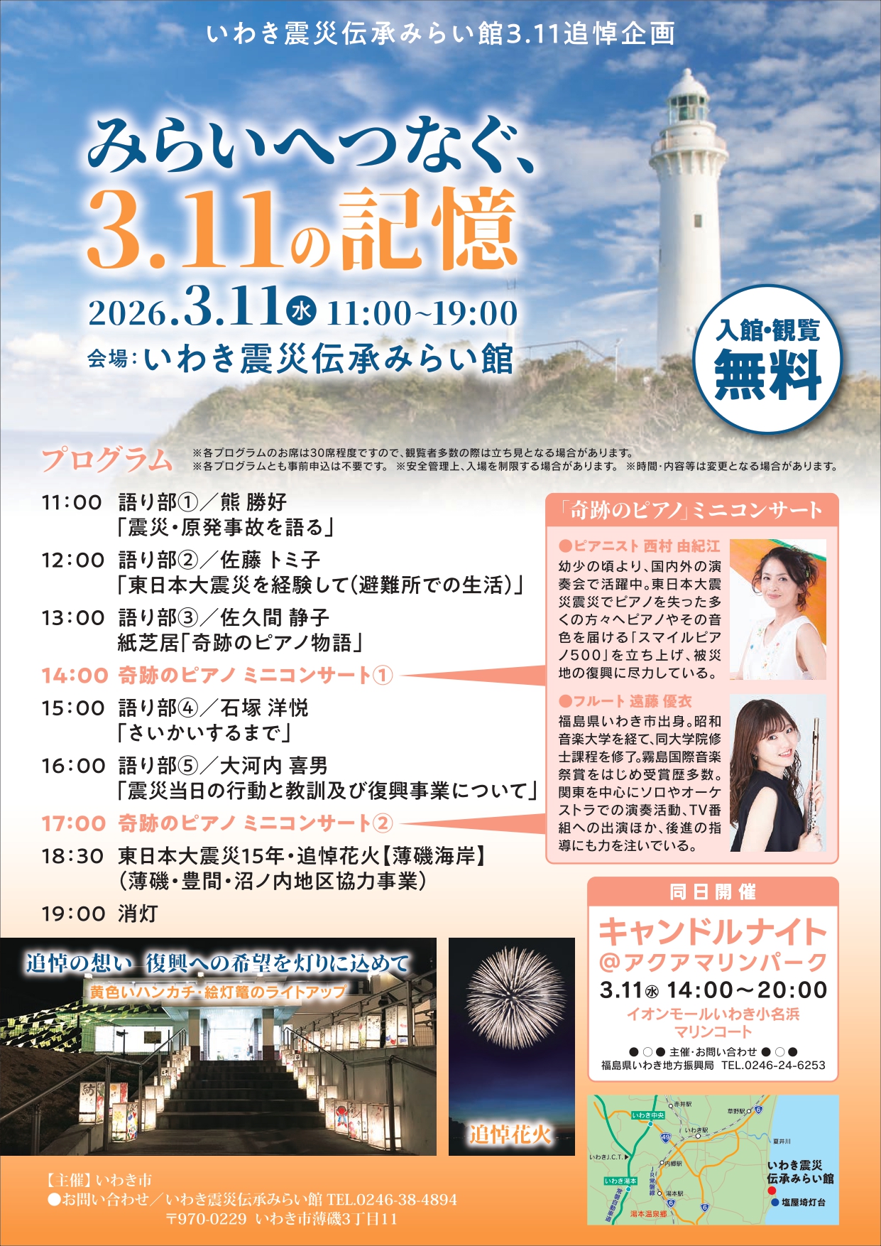2026-01-26 [いわき震災伝承みらい館3.11追悼企画]『みらいへつなぐ、3.11の記憶』開催のご案内 令和8年3月11日(水)、東日本大震災の追悼企画として、当館にてイベントを開催いたします。 ぜひお越しください。 ~イベントスケジュール、主な内容~ [プログラム] 11:00 語り部講話①/熊 勝好「震災・原発事故を語る」 12:00 語り部講話②/佐藤 トミ子「東日本大震災を経験して(避難所での生活)」 13:00 語り部講話③/佐久間 静子「奇跡のピアノ物語」 14:00 奇跡のピアノミニコンサート① 15:00 語り部講話④/石塚 洋悦「さいかいするまで」 16:00 語り部講話⑤/大河内 喜男「震災当日の行動と教訓及び復興事業について」 17:00 奇跡のピアノミニコンサート② 18:30 東日本大震災15年・追悼花火【薄磯海岸】 (薄磯・豊間・沼ノ内地区協力事業) 19:00 消灯 イベント終了 ※ 各プログラムのお席は30席程度ですので、観覧者多数の際は立ち見となる場合があります。 ※ 安全管理上、入場を制限する場合があります。 ※ 時間・内容等は変更となる場合があります。 [館外イベント] ●当館正面の芝生におきまして、「黄色いハンカチ」に様々な方々から追悼への想い、 復興への希望のメッセージ等を書いていただいたものを展示します。 ●夕方からは、「黄色いハンカチ」と、市内の方に描いていただいた「絵灯篭」のライトアップをします。 ●18:30からの「東日本大震災15年・追悼花火」は、薄磯海岸において実施します。 震災から15年の節目、地域の皆さんの協力をいただき実施する追悼花火をご覧ください。 ※ 安全確保等の観点から、当日は薄磯多目的広場の一部の駐車が制限されます。 あらかじめご了承ください。 詳細は、こちらをご覧ください 〇開催チラシ(ダウンロードできます(pdfファイル)) 【主催】いわき市 ●お問合わせ:いわき震災伝承みらい館 TEL 0246-38-4894 一覧へ戻る