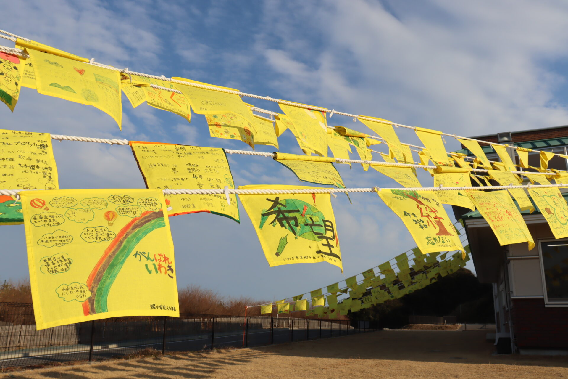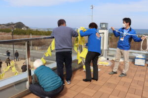 2026-01-26 【いわき語り部の会】 3月1日(日)より「未来へのメッセージ~黄色いハンカチ~」を展示します 3月1日(日)から、いわき語り部の会は、「未来へのメッセージ~黄色いハンカチ~」の展示を当館で開始します。 市内外の多くの方にメッセージやイラストをご記入いただいた黄色いハンカチを、当館正面広場に展示します。 3月31日(火)まで展示する予定ですので、この機会にご覧ください。 昨年度の括りつけ・展示作業の様子 昨年度の展示状況 一覧へ戻る